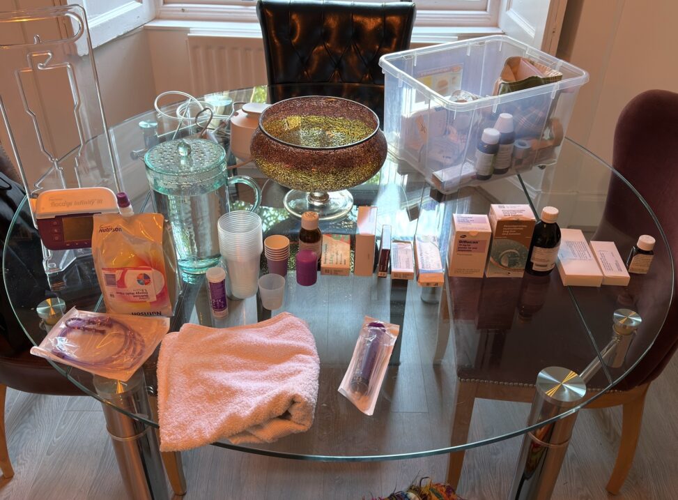 Mornings became bleak. The Rock made a long, terrifying list of meds: first thing meds, mid-morning meds, lunch, mid-afternoon, teatime, mid-evening, bedtime. He laid them all out next to my daily food bag like some sort of pharmaceutical tapas. At the beginning, I was on 30+ tablets a day. Every single one had to be crushed, mixed with water, syringed into the tube, then the tube flushed. Over and over. It took about 45 minutes to do the full routine, including hooking up the travelling food machine. Mega boring. Zero glamour.